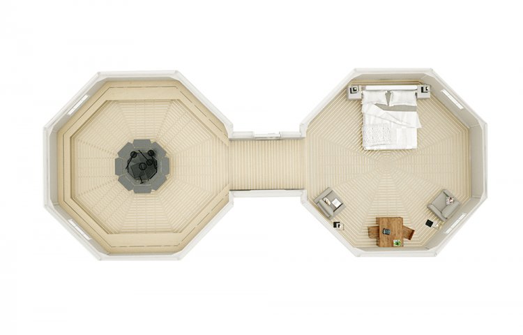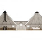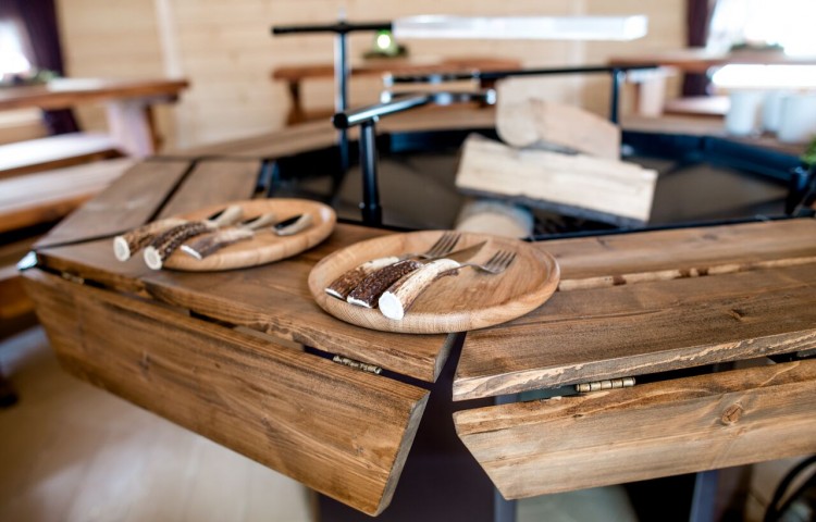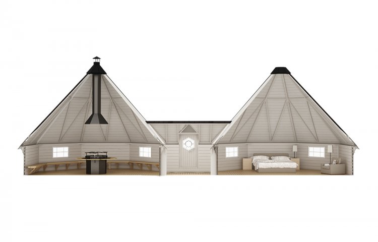 There is a convenient wood- or charcoal-fired grill with a table around it inside the cabin. Also, one adjustable cooking platform and two special platforms for a kettle, frying pan, etc. can be found. Above the grill there is an adjustable chimney. Finally, the cabin is lockable, and there is a small porch with a roof at the entrance.