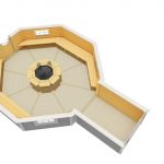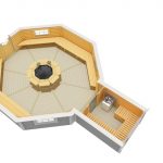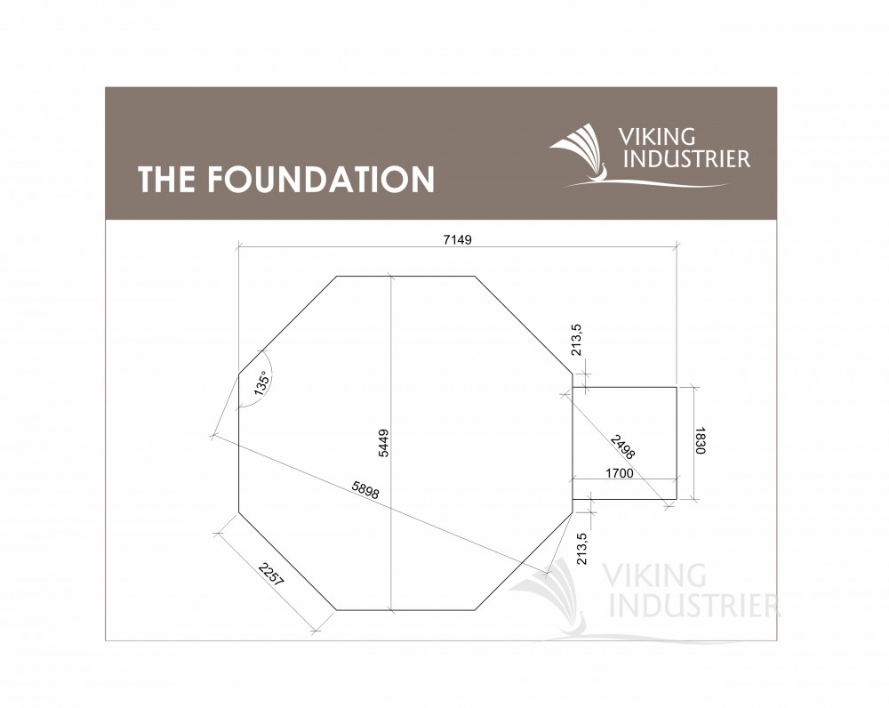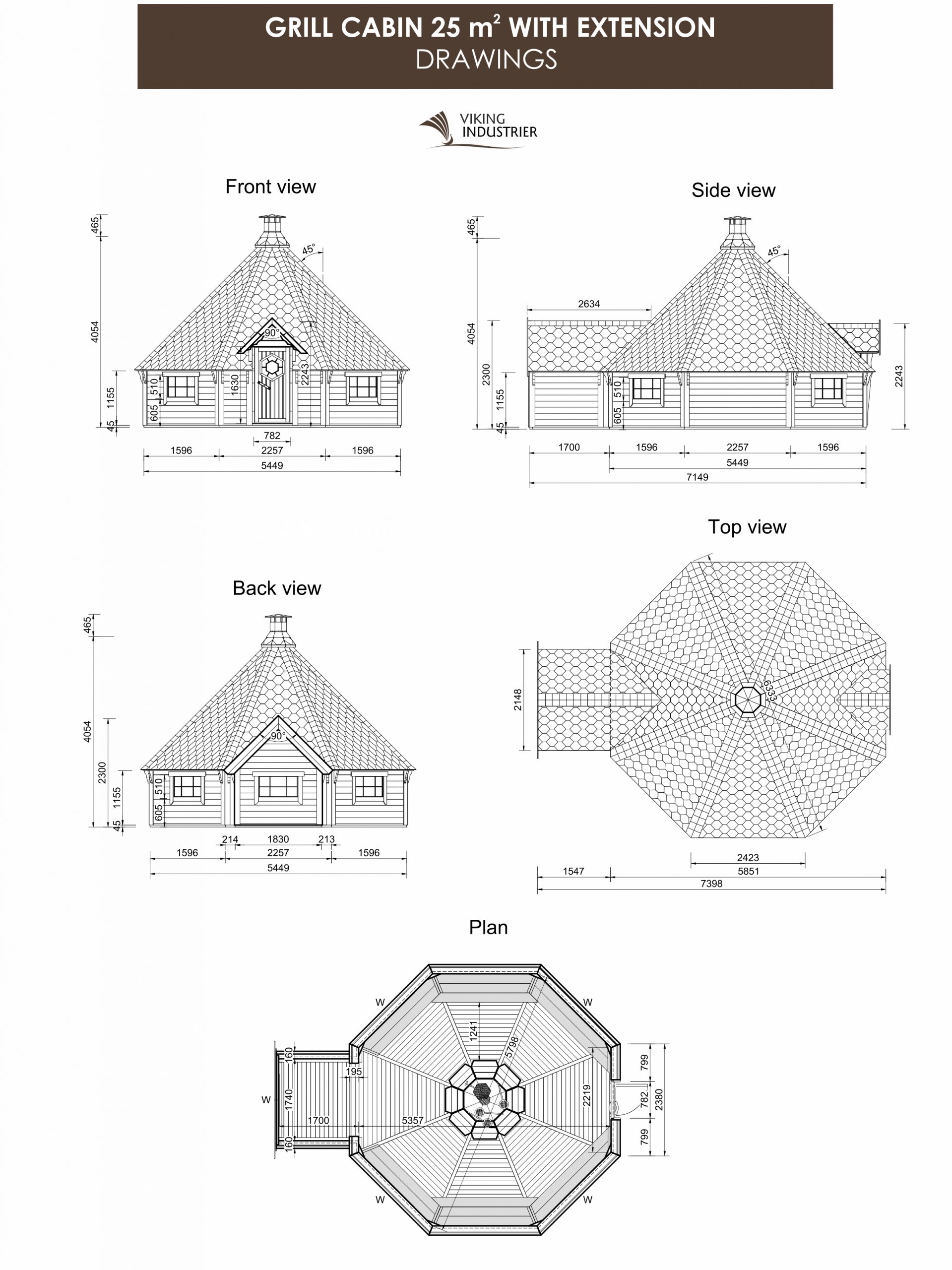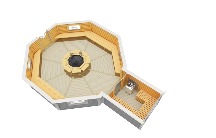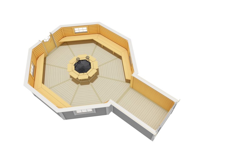 People 25-30 persons Timber Spruce Shape Octagon + Rectangle Room 2 Inside area 28.0m2 Total height 4519mm Wall height 1155mm Floor thickness 18mm Wall thickness 45mm External dimension 5449 x 7149 mm Door size 782 x 1760 mm Window size 880 x 510 mm - STANDARD SET