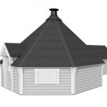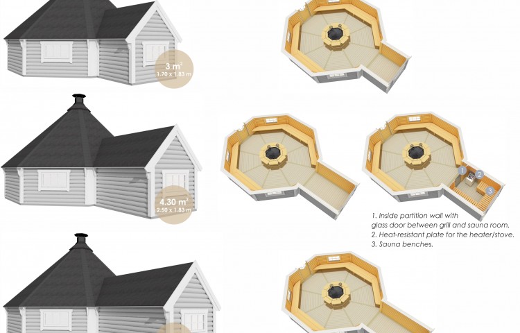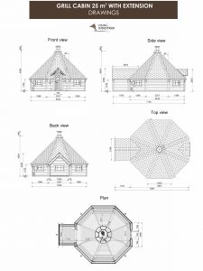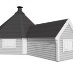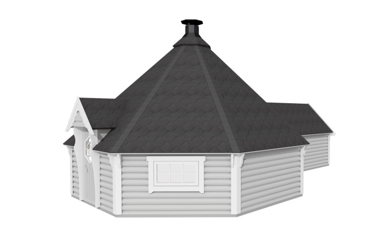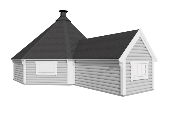 Wall, floor, roof panels from spruce; Roof covered with bitumen shingles of your selected color; Inside standard grill with cooking platforms; Table around the grill; Adjustable chimney; 5 double glass windows (3 of them are opening); Door with a lock and hexagon window; 6 inside benches from spruce (2 of them are folding benches); Cushions for benches of your selected color: brown or blue; Standard extension’s size 1.83 x 1.70 m. - DELIVERY
