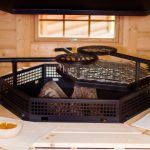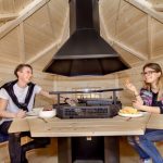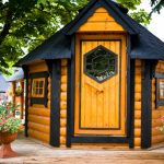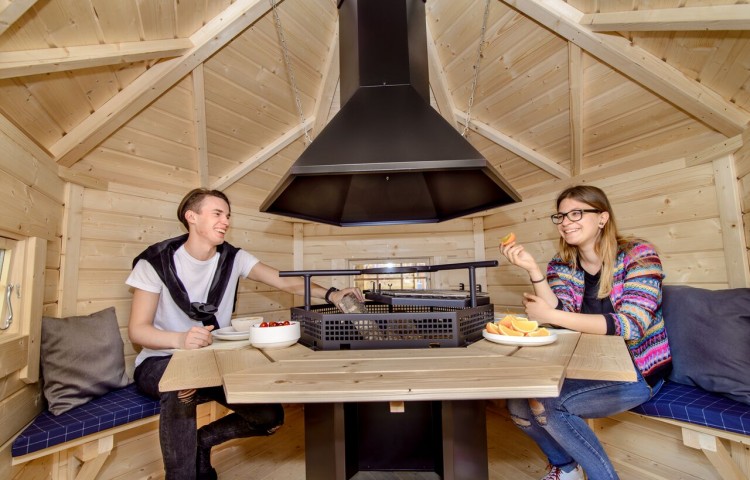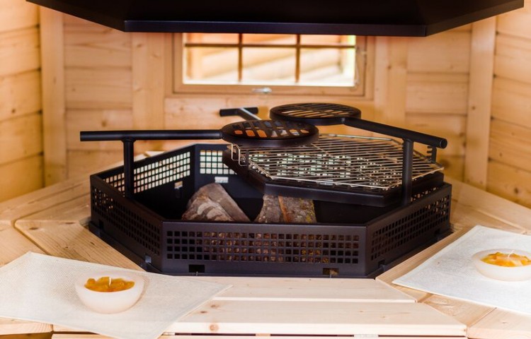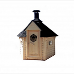 High-quality materials ensure the longevity of the grill house and easy use. Cabin walls are made of rounded spruce boards. The roof is made of six elements, thus the system can withstand the considerable weight. Cabin roof is covered with bitumen shingles (different colors can be selected), and there are three opening double glazed windows. Besides that, the door is decorated with the original hexagonal window. You also will get 3 spruce benches inside the cabin by the walls. The floor is easily assembled from separate components. There is a convenient wood or charcoal-fired grill with a table around it inside the cabin. Above the grill, there is an adjustable chimney. Finally, the cabin is lockable and there is a small porch with a roof at the entrance.