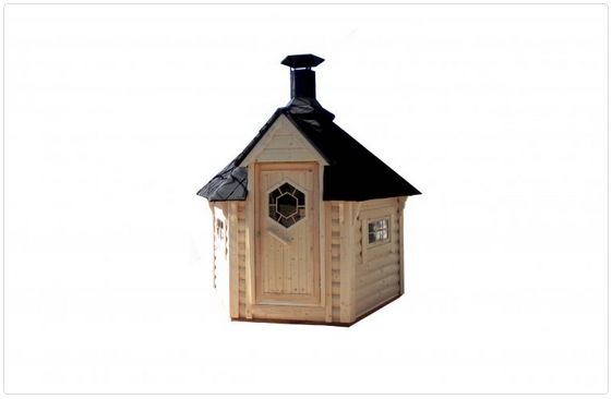 Wall, floor, roof panels; Roof covered with bitumen shingles of your selected color; Inside grill with the cooking platforms and a table around the grill; Adjustable chimney; 3 double glass windows (all of them are opening); Door with a lock and a hexagon window; 3 benches (with cushions) inside. - DELIVERY