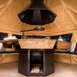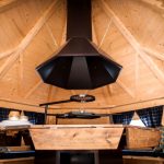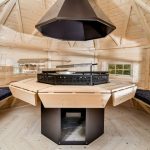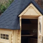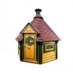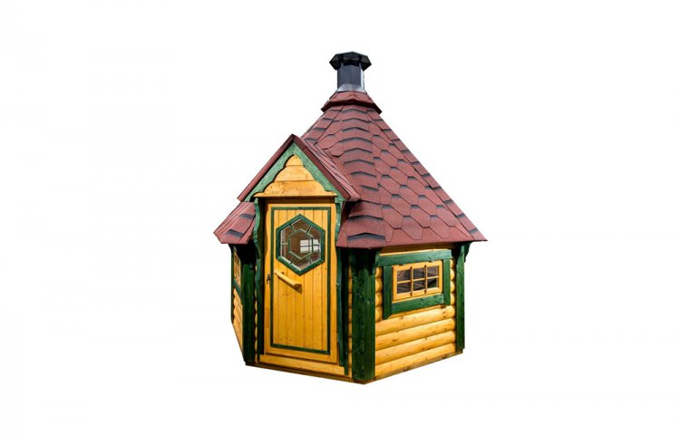 High-quality materials ensure the longevity of the grill house and easy use. Cabin walls are made of rounded spruce boards with the dimension 45 x 145 mm. The roof is made of eight elements, thus the system can withstand the considerable weight. Cabin roof is covered with bitumen shingles (different colors can be selected), and there are four opening double glazed windows. Besides that, the door is decorated with the original hexagonal window. You can also find spruce benches inside the cabin by the walls. The floor is easily assembled from separate components. There is a convenient wood- or charcoal-fired grill with a table around it inside the cabin. Finally, the cabin is lockable and there is a small porch with a roof at the entrance.