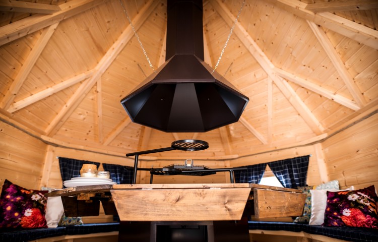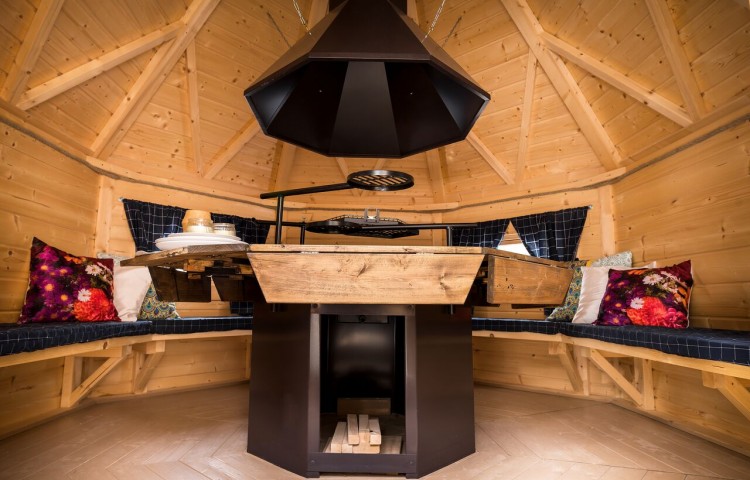 Wall, floor, roof panels; Roof covered with bitumen shingles of your selected color; Inside grill with the cooking platforms and a table around the grill; Adjustable chimney; 4 opening windows with double glass; Door with a lock and a hexagon window; 5 indide benches plus cushions. Cushions for the benches. - DELIVERY
