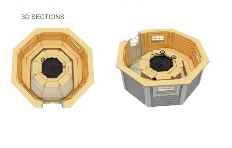 People 5-10 persons Timber Spruce Shape Octagonal Room 1 Inside area 6.9m2 Total height 3327mm Wall height 1205mm Floor thickness 18mm Wall thickness 45mm External dimension 2209 x 2909 mm Door size 782 x 1630 mm Window size 680 x 380 mm - STANDARD SET