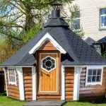 Wall, floor, roof panels; Roof covered with bitumen shingles of your selected color; Inside standard grill with cooking platforms; Tables around the grill; Adjustable chimney; 3 double glass windows (1 of them is opening); Door with a lock and a hexagon window; 5 inside benches from spruce (2 of them are folding benches); Cushions for benches of your selected color.  - DELIVERY