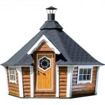 Design, ergonomics and more comfortable sitting places let you fall in love with the product immediately! Grill cabin 9.2 m2 with sloping walls will help your garden look amazing. High-quality materials ensure the longevity of a grill house and easy use. Cabin walls are made of rounded spruce boards.