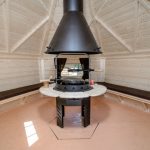 Inside the cabin, there is a convenient wood- or charcoal-fired grill with a table around it. Also, one adjustable cooking platform and two special platforms for a kettle, frying pan, etc. can be found. Above the grill, there is an adjustable chimney. Finally, the cabin is lockable, and there is a small porch with a roof at the entrance.