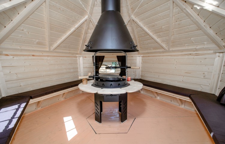 Inside the cabin, there is a convenient wood- or charcoal-fired grill with a table around it. Also, one adjustable cooking platform and two special platforms for a kettle, frying pan, etc. can be found. Above the grill, there is an adjustable chimney. Finally, the cabin is lockable, and there is a small porch with a roof at the entrance.