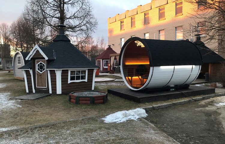 The cabin has three double glazed windows, one of which opens. Besides that, the door is decorated with an original hexagonal window. Also, there are five benches in the cabin; two of these benches easily transform into holding benches: just turn over the additional board. The floor is easily assembled from separate components.