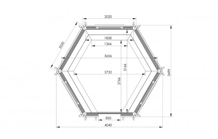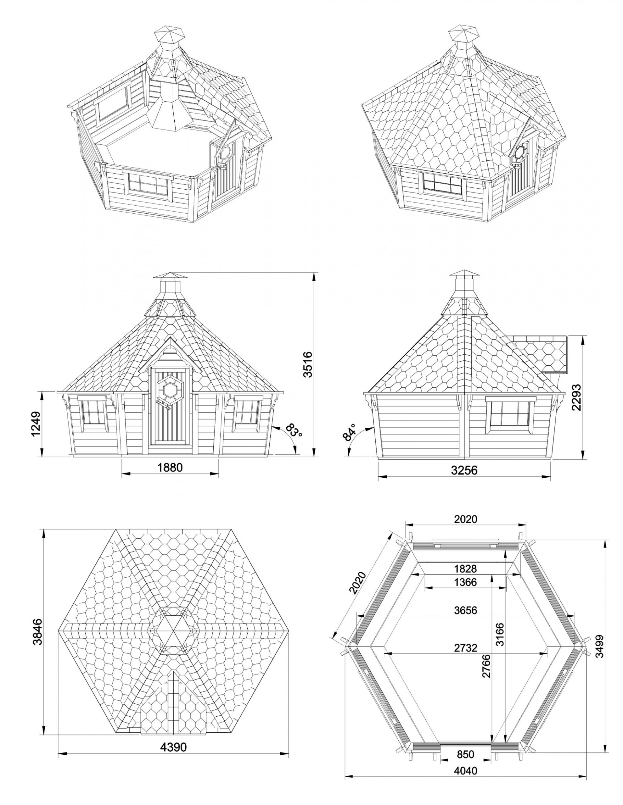 People 12-15 persons Timber Spruce Shape Hexagon Room 1 Inside area 9.2m2 Total height 3062mm Wall height 1159mm Floor thickness 18mm Roof thickness 18mm Wall thickness 45mm External dimension 3760 x 3256 mm Door size 782 x 1630 mm Window size 880 x 510 mm  - STANDARD SET