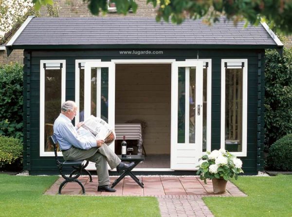 A medium-sized, stylish log cabin with saddle roof. The large windows and double doors offer perfect views of your garden. The B13 log cabin is our all time best seller, suitable for all kinds of purposes. Number of windows and position can be changed for your own needs, looks perfect with two or four windows next to the matching double doors.