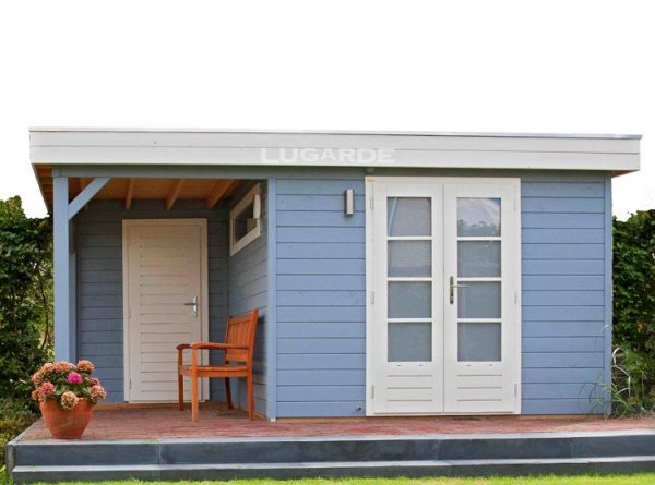 Summerhouse PR16 with a low roof (≤ 250 cm). This model measures 9m² and has a side canopy. The PR16 allows you to create an oasis dedicated to hobbies and relaxation. Or you can simply place a bench underneath the side canopy and enjoy your morning coffee there!