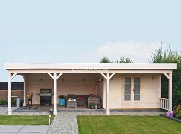 Low roof available (≤ 250 cm) without additional costs. This summerhouse with integrated veranda will soon become the central point of your garden. It has a modern yet classic look, the total width is no less than 900 cm and the wall thickness is 44 mm. This multifunctional summerhouse with a strikingly large patio offers plenty of room for a dining area or a lounge corner. Meanwhile, the room next door has plenty of storage space.